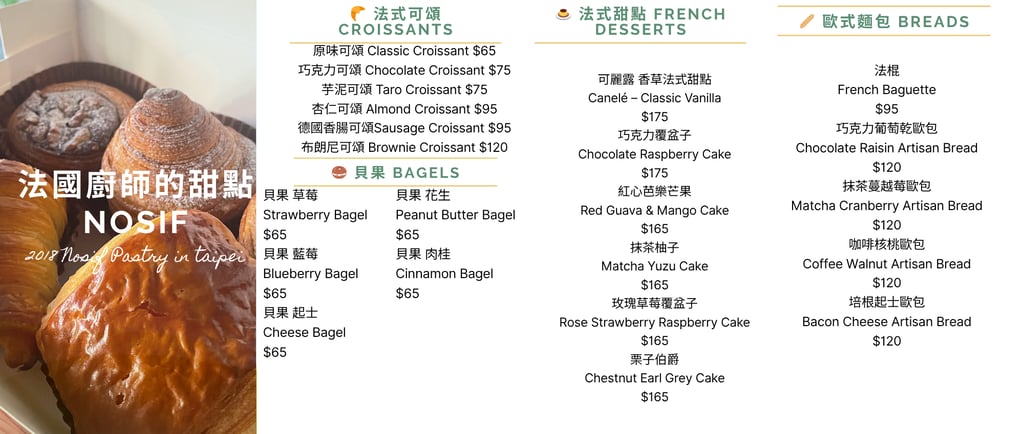 如需線上訂購或更多資訊,請關注我們的 Facebook / Instagram,或前往我們的官方網站 nosifpastry.shop